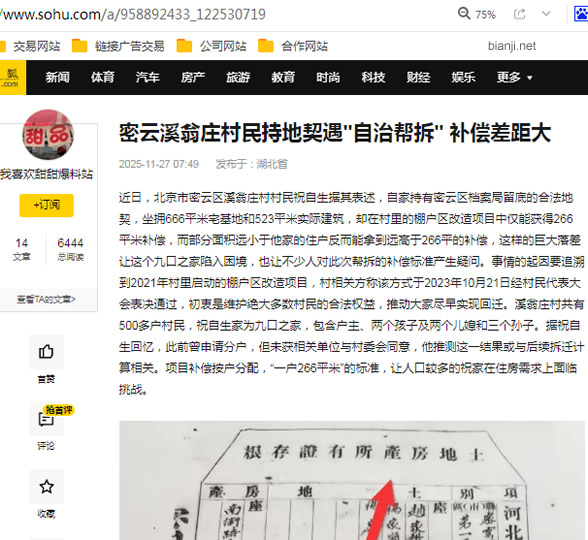 近日,北京市密云区溪翁庄村村民祝自生据其表述,自家持有密云区档案局留底的合法地契,坐拥666平米宅基地和523平米实际建筑,却在村里的棚户区改造项目中仅能获得266平米补偿,而部分面积远小于他家的住户反而能拿到远高于266平的补偿,这样的巨大落差让这个九口之家陷入困境,也让不少人对此次帮拆的补偿标准产生疑问。事情的起因要追溯到2021年村里启动的棚户区改造项目,村相关方称该方式于2023年10月21日经村民代表大会表决通过,初衷是维护绝大多数村民的合法权益,推动大家尽早实现回迁。溪翁庄村共有500多户村民,祝自生家为九口之家,包含户主、两个孩子及两个儿媳和三个孙子。据祝自生回忆,此前曾申请分户,但未获相关单位与村委会同意,他推测这一结果或与后续拆迁计算相关。项目补偿按户分配,“一户266平米”的标准,让人口较多的祝家在住房需求上面临挑战。
