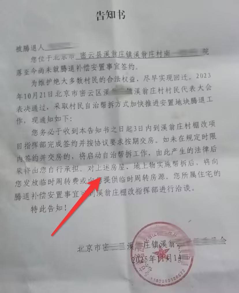 在补偿面积核算上,祝自生家666平米宅基地、523平米建筑,与部分300平米左右宅基地住户获得的平米补偿的情况几乎相等。基于对补偿标准的不同理解,祝自生尚未签署补偿协议。据祝自生介绍,村委会已对部分未签约村民实施拆除,他也曾收到告知书,内容显示若3日内未签约交房,将启动“自治帮拆”。祝自生称,希望按宅基地实际合法面积及国家统一相关标准核算补偿,而村委会提出按“一个院落266平米”执行,双方暂未达成一致。