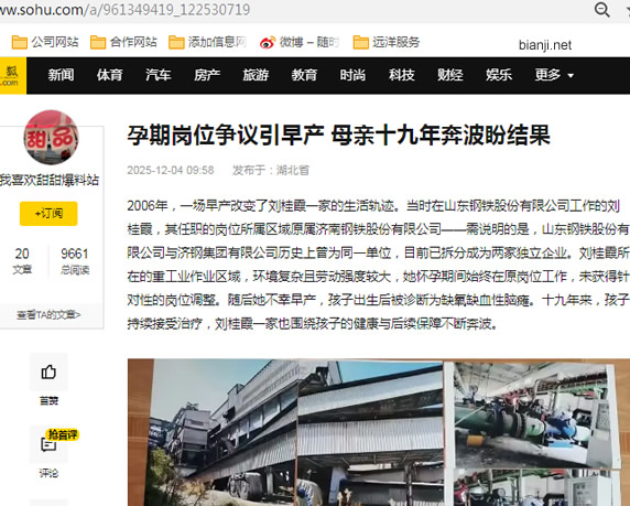 2006年,一场早产改变了刘桂霞一家的生活轨迹。当时在山东钢铁股份有限公司工作的刘桂霞,其任职的岗位所属区域原属济南钢铁股份有限公司——需说明的是,山东钢铁股份有限公司与济钢集团有限公司历史上曾为同一单位,目前已拆分成为两家独立企业。刘桂霞所在的重工业作业区域,环境复杂且劳动强度较大,她怀孕期间始终在原岗位工作,未获得针对性的岗位调整。随后她不幸早产,孩子出生后被诊断为缺氧缺血性脑瘫。十九年来,孩子持续接受治疗,刘桂霞一家也围绕孩子的健康与后续保障不断奔波。