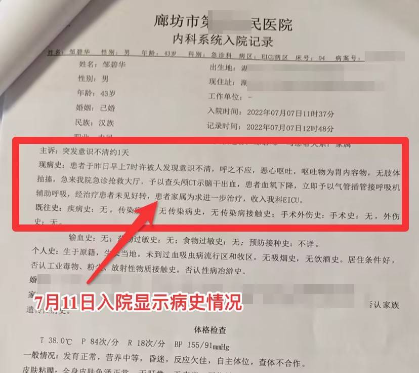 2021年1月9日,邹碧华被霸州市某部门以涉嫌合同诈骗刑事拘留,家庭瞬间陷入慌乱,彼时他的两个孩子大的仅9岁、小的才3岁。同年2月1日,经霸州市人民检察院批准,次日他被依法逮捕,开始了漫长的羁押生活。2021年10月该案开庭,仅持续三天便草草收场:第一天公诉机关以合同诈骗罪起诉,给出5至7年量刑建议,作为遵纪守法的公民,这份量刑建议给邹碧华带来巨大心理和精神压力,让他在羁押期间备受煎熬。庭审第二,起诉罪名突变为帮助他人合同诈骗,第三天仓促休庭未作判决,此后直至邹碧华离世,该案始终停滞无进展。令人痛心的是,邹碧华的监视居住期限十分短暂。2022年7月,其在羁押期间突发脑干出血,霸州市人民法院随后批准对其采取监视居住措施并将其释放,释放后邹碧华一直处于医院治疗状态。截至此时,邹碧华已被累计羁押544天。被释放仅8天后,邹碧华因脑干出血经全力抢救无效离世,享年43岁。